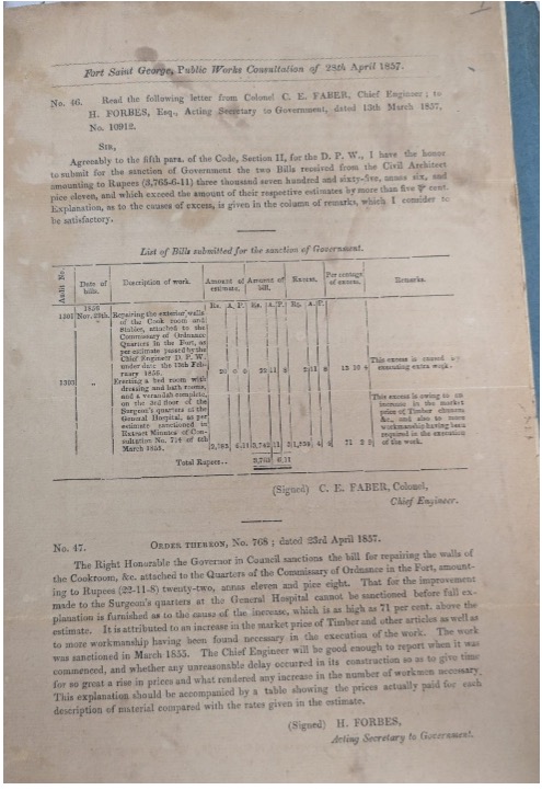 Many of the documents are missing and cannot be retrieved. Public and Military documents between 1858-1947 have not been maintained or preserved. Most of them are not available. From my experience, even the documents that are found have missing drawings and sketches. The documents before 1858 are undergoing the process of preservation. Documents of the Public Department are mostly available, but the military ones are not all available.