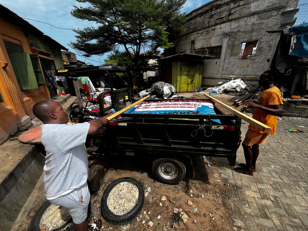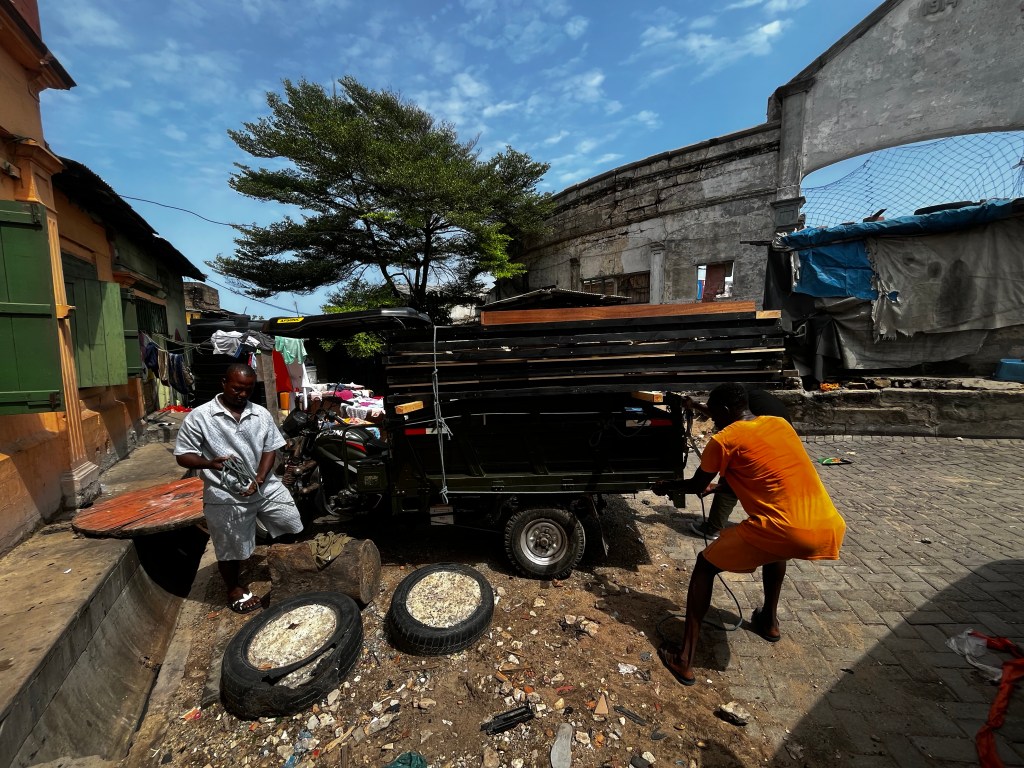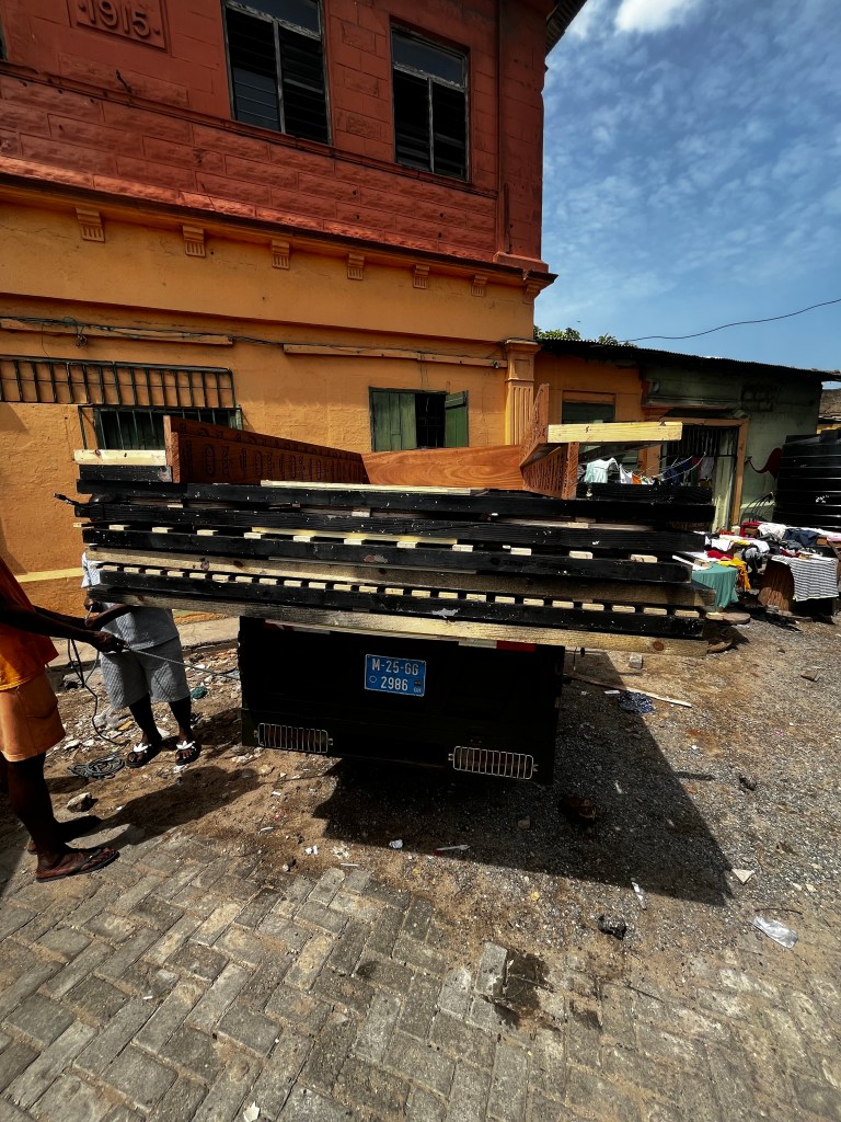 The Kingsway Exhibition has been sent to Accra and carefully stored at the Jamestown Cafe for a few months now. We were finally able to unpack the vast pallet on Friday morning and spent the weekend constructing the two pavilions and installing the light boxes and panels.