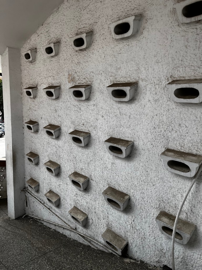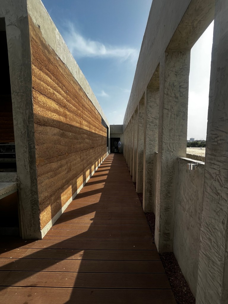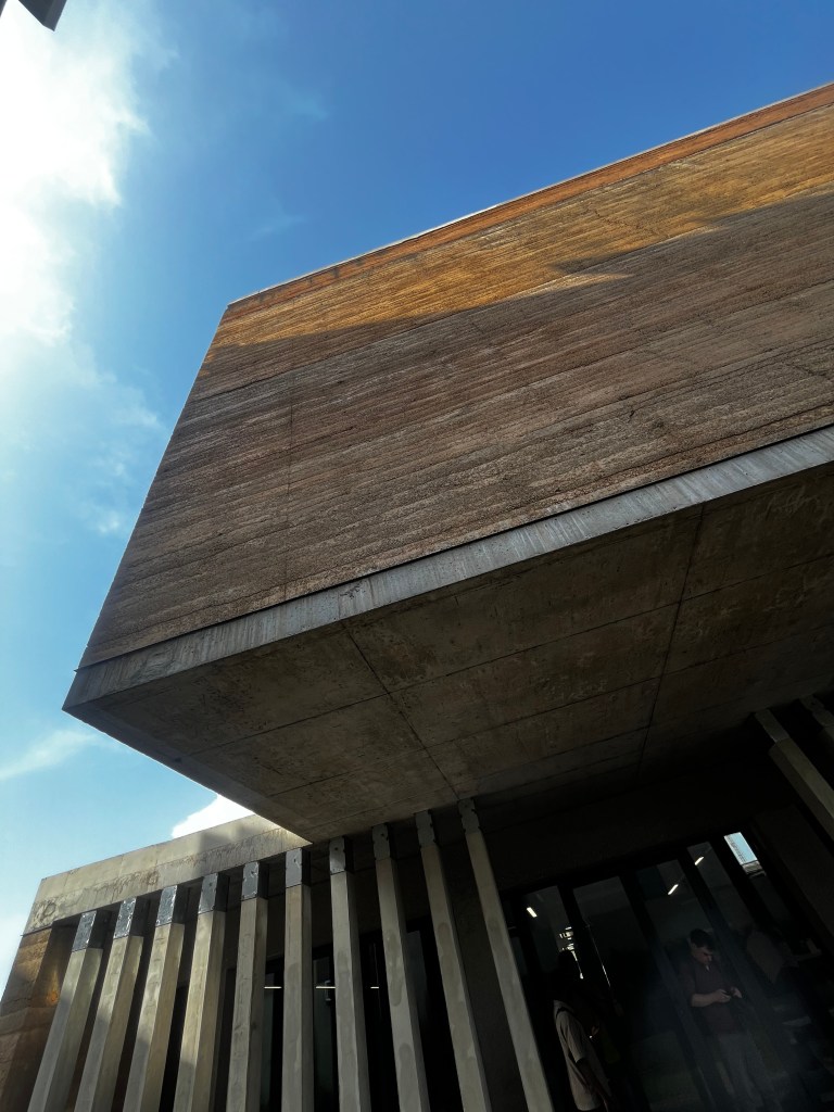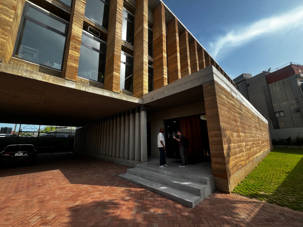 I’m intrigued by the precast panels and would like to learn more about the detailing. How was it possible to transport rammed earth – surely there’s a significant amount of cement in these panels to hold them together, and how is the top of the panels protected from the heavy rain? I’ll have to investigate further. Read more and see far better photos here: https://www.archdaily.com/1036713/backyard-community-club-deroche-projects. We saw at nearby Dot Atelier the flashing interventions being made around the windows to project the adobe ‘sandcrete’. I admire both buildings for experimenting and developing such uplifting and carefully designed spaces.