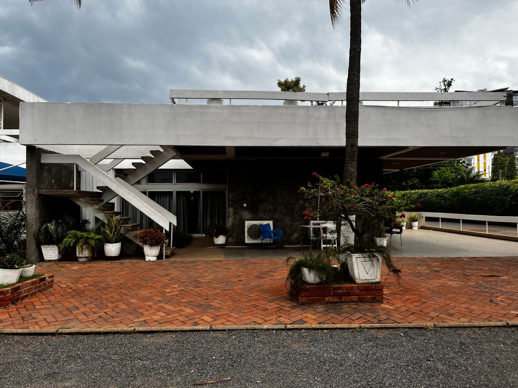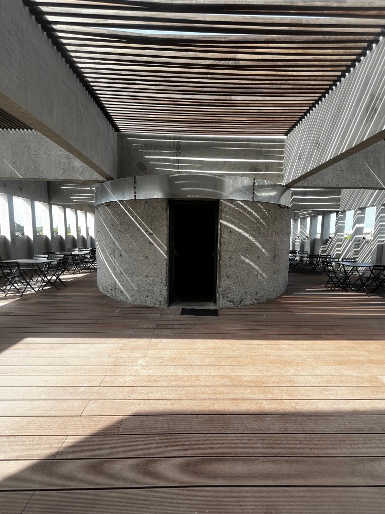 I finally visited the Nubuke_foundation today – a contemporary arts centre in East Legon, Accra . A very exciting structure that was fun to explore . I got there early and had the entire place to my self. Exclusively en situ concrete with the main gallery on piloti the space is lit from the large windows at either end of the linear structure. The shaded outside space under the gallery creates an exterior garden gallery (and cinema), and a carefully cast cantilevered staircase leads up the main entrance. The doors have the Le Corbusier inspired eccentric pivot, found frequently in Chandigarh, and there are certainly other motifs redeployed from the Modernist 5 points. It’s not derivative or cliched though – far from it. The building responds very well to the site and the vast -louvred window facades at each end offer fine views whilst being shaded from the concrete that projects beyond.