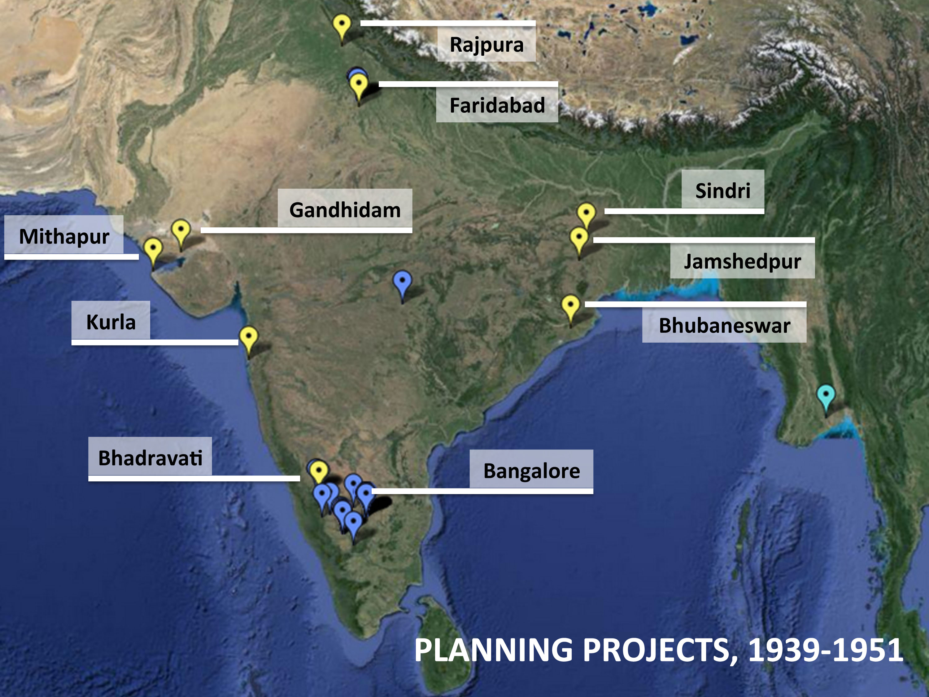 Map showing location of Otto Koenigsberger’s planning projects in India, 1939-1951