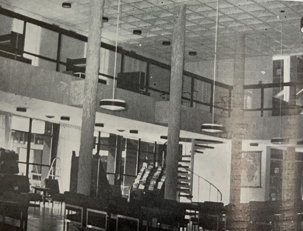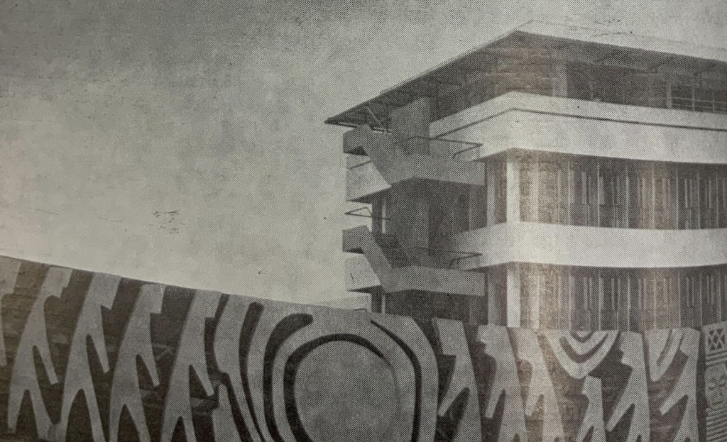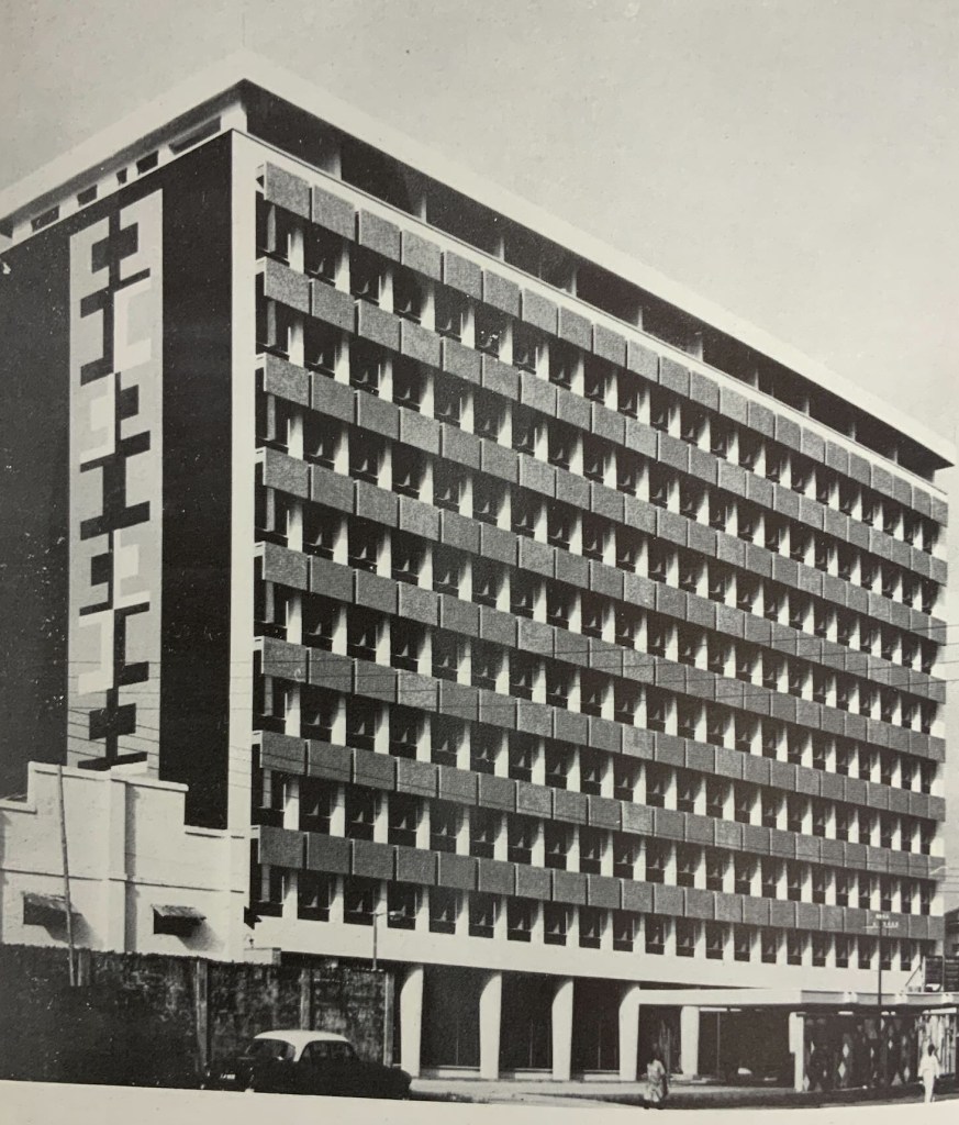 Contributing to this West African style was the Design Group’s “Nigerian Institute of International Affairs” (located on Lagos’s Kofo Abayomi Street). It was discussed at length by Alan Vaughan-Richards in the March/May 1968 edition of the magazine, where he particularly admired the sculptural mural, ‘The Art of Understanding” by Erhabor Emokpae in tooled concrete that revealed the granite aggregate. Inside the Institute are further sculptural elements, including a bronze figure representing Knowledge by Ben Enwonwu and positioned hovering above an evaporation pool. The interior includes some grand double-height spaces, dramatic cantilevered spiral staircases and travertine marble cladding (donated by the Italian contractor). At the rear of the plot there is an octagonal conference room with a dramatic star-shaped roof (still visible on Google maps).