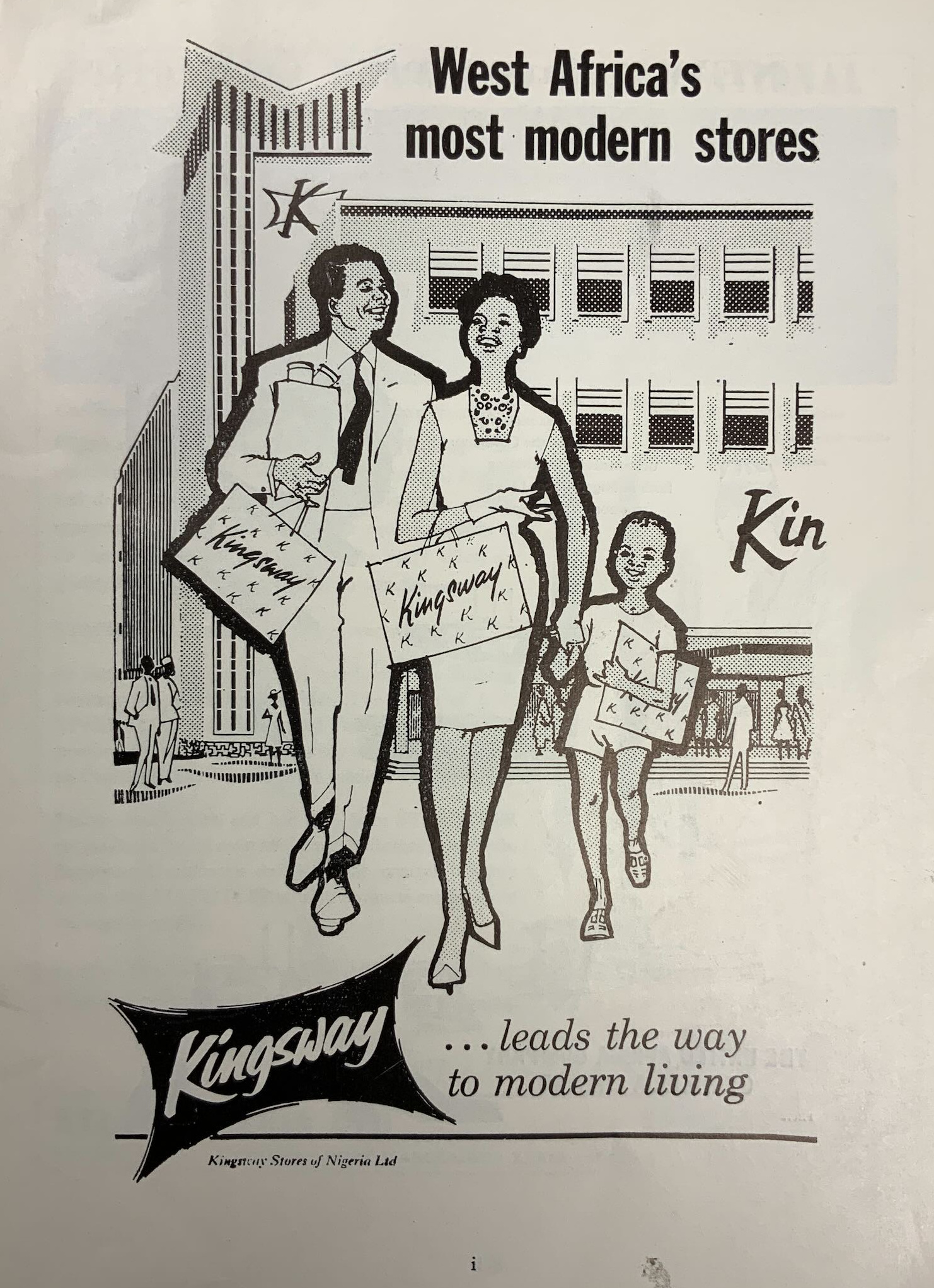 At the same time, ‘traditional’ and ‘local’ practices were celebrated and discussed. There is something disarming in this technique. An ahistorical image was usually shown on the front cover, often a decontextualised figure in traditional dress sometimes playing an instrument – followed on the inner leaf by an advertisement for the latest fashions from Kingsway department store. The advertisers tended to belong to, or were in partnership with, the UAC group (e.g. Taylor Woodrow, Guinness, Kingsway Stores), and it seems likely their extensive patronage held some sway over the editorial content. The adverts were not geared towards selling specific products, but were there simply to bolster public opinion and shift attitudes towards modernity, progress, and societal advancement alongside a romanticised nationalist sense of history and culture.