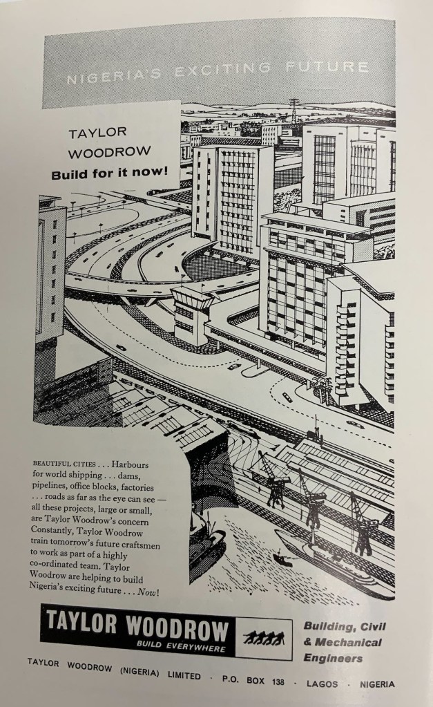 “Tower cranes were on the scene in 1955 and by 1961 two twenty-five-storey buildings had been completed in Ibadan and Lagos built by Italian firms who thirty years earlier were struggling with their labour force to build small houses”