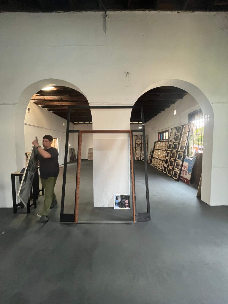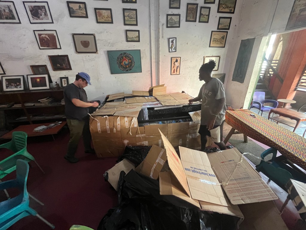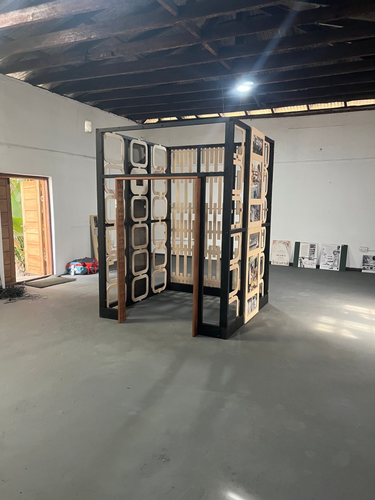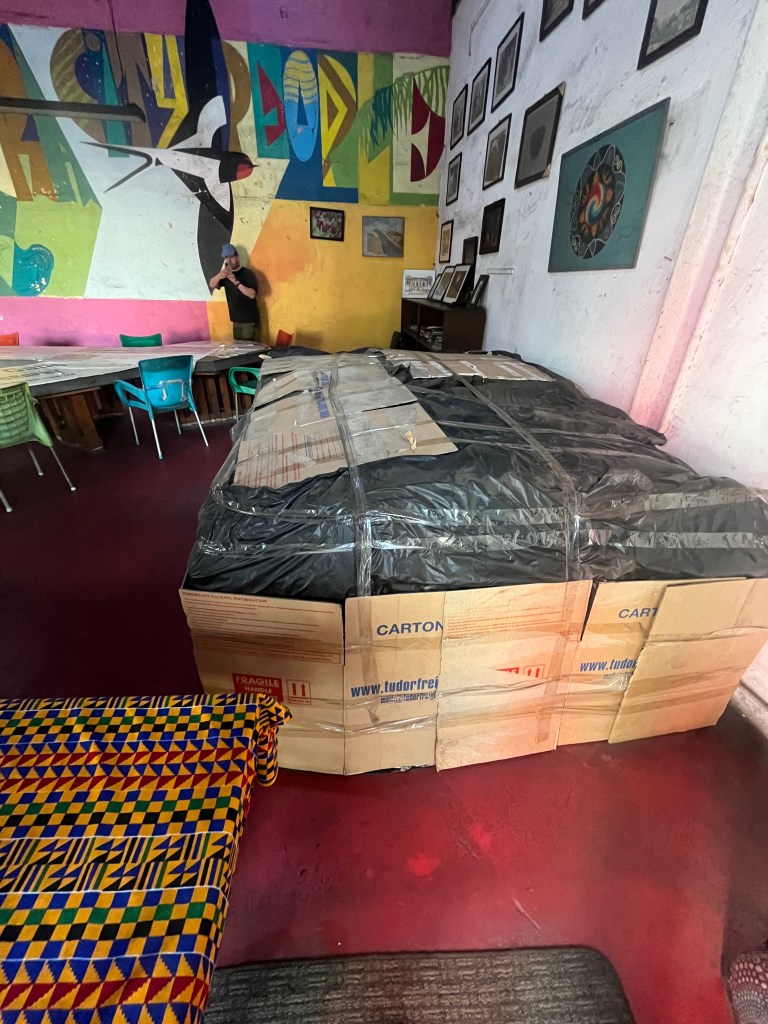 The Kingsway Exhibition has been sent to Accra and carefully stored at the Jamestown Cafe for a few months now. We were finally able to unpack the vast pallet on Friday morning and spent the weekend constructing the two pavilions and installing the light boxes and panels.