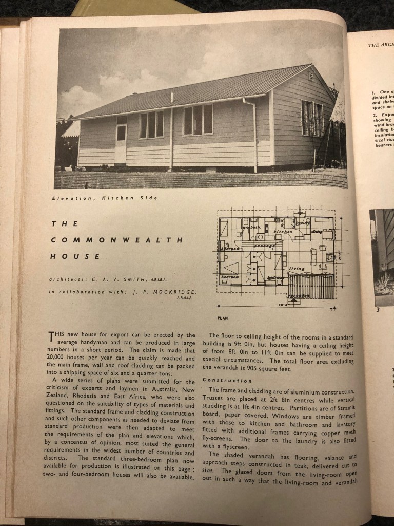 In theย Architect and Building News from July 1952 there’s an intriguing article for a partially-prefabricated โ€˜Commonwealth Houseโ€™.