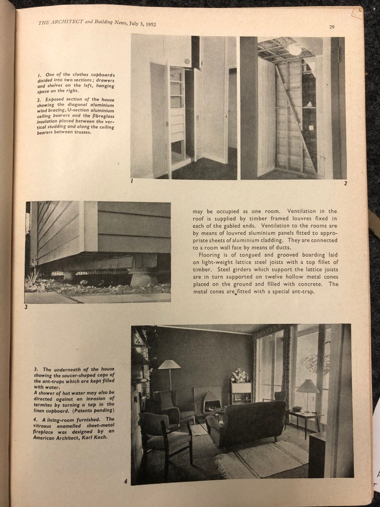 The house had an aluminium frame structure, and the cladding materials could vary depending on availability and final conditions. It was placed on concrete posts with an ant-trap to resist termite attack. The prototype erected on Great West Road in Hounslow was fitted out with furniture and a fireplace designed by American architect Carl Koch (1912-1998), who later pioneered several prefabricated house designs in the US.ย