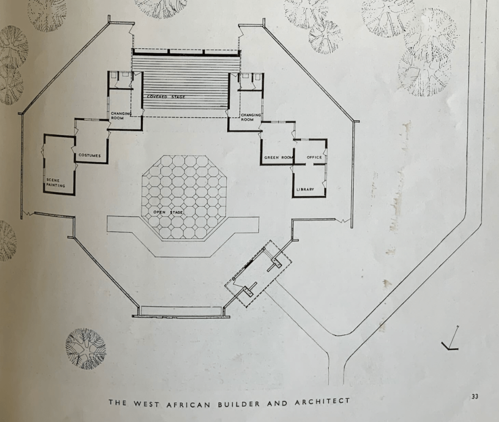 In 1958, the Ghana Arts Council and the Rockefeller Foundation provided the necessary funding to set up ‘the Experimental Theatre Players’ spearheaded by Efua Sutherland and Joe Degraft. Architects Gerlach and Gillies-Reyburn were commissioned to design the structure which was based around two performance stages – one ‘in the round’ and the other a proscenium arch theatre. It was Sutherland who generated the design strategy,